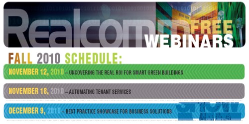 Realcomm is making three webinars available at no charge this fall. Subjects will be Uncovering the Real ROI on Smart Green Buildings, Automating Tenant Services, and Best Practice Showcase for Business Solutions